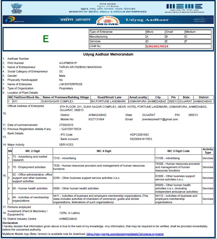 Udhyog Aadhaar Certificate